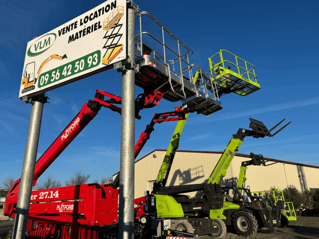 L'agence VLM - Vente et Location de Matériel - à Veauche se spécialise dans la location d'engins BTP, levage et manutention avec un parc de nacelles araignées, nacelles ciseaux, nacelles articulées mais aussi sur des mini-pelles, chariots élévateurs, télescopiques ou pick-up. Un magasin s'ouvre en parallèle pour la vente de produits BTP et travail en hauteur.